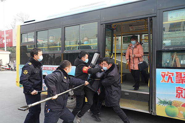 在火車站首末站,恰逢一車隊(duì)工作人員正在開展疫情防控應(yīng)急演練,一未佩戴口罩的乘客欲乘車,駕駛員制止后,該乘客非但不聽,強(qiáng)行上車后辱罵、持刀相向駕駛員,駕駛員隨即將情況報(bào)告車隊(duì)長并報(bào)警,車隊(duì)安保人員將其制服。看完演練后,熊衛(wèi)軍、錢萬輝對工作人員面對突發(fā)事件的應(yīng)急處置能力點(diǎn)贊。